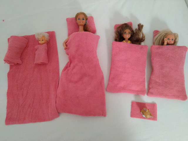 Bettdecken für Barbie und ihre Kinder, dazu noch zwei große Kuscheldecken und zwei kleine: